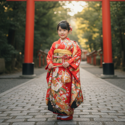 赤い振袖に包まれて、華やかな7歳の祝い姿