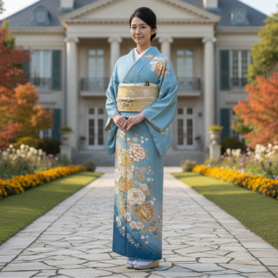 爽やかな水色の訪問着で、清楚に装う秋のお出かけスタイル