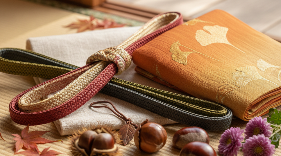 着物の印象を大きく左右するのが帯まわりの小物です。色や素材に秋らしさを取り入れることで、ぐっと季節感のあるコーディネートになります。