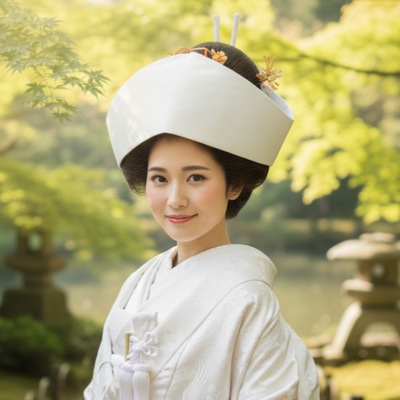 A soft white silk hood worn over the wig during a Shinto wedding ceremony — representing purity and the bride’s new beginning.