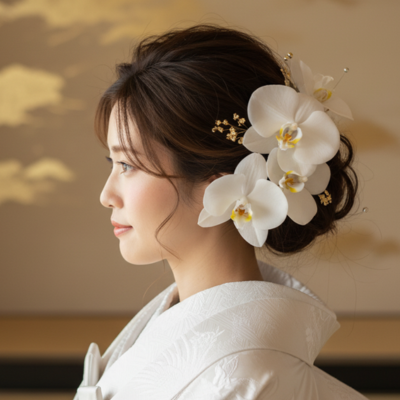 A modern bridal hairstyle adorned with white phalaenopsis orchids — a symbol of elegance and purity, perfect for a contemporary Japanese look.
