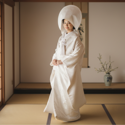 A bride in shiromuku, the pure white kimono symbolizing new beginnings and sacred purity. Traditionally worn for the wedding ceremony.
