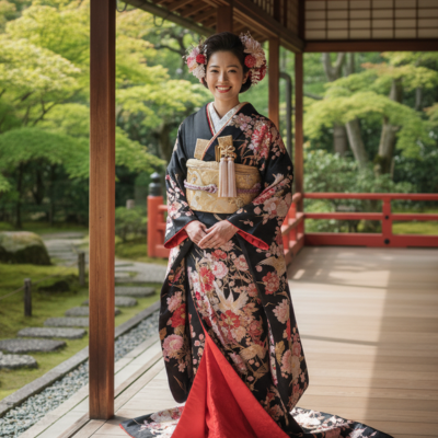 Among them, the hikifurisode is especially special: the long hem is worn trailing gracefully along the floor, a style reserved exclusively for brides.