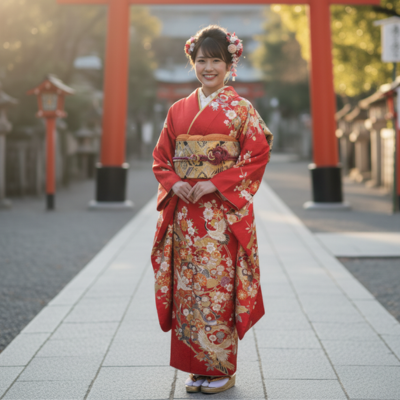 A furisode typically worn for Japan’s Coming-of-Age celebration at age 20.The hem is worn shorter, with the front panel tucked (ohashori) and the overall styling lighter than bridal wear.