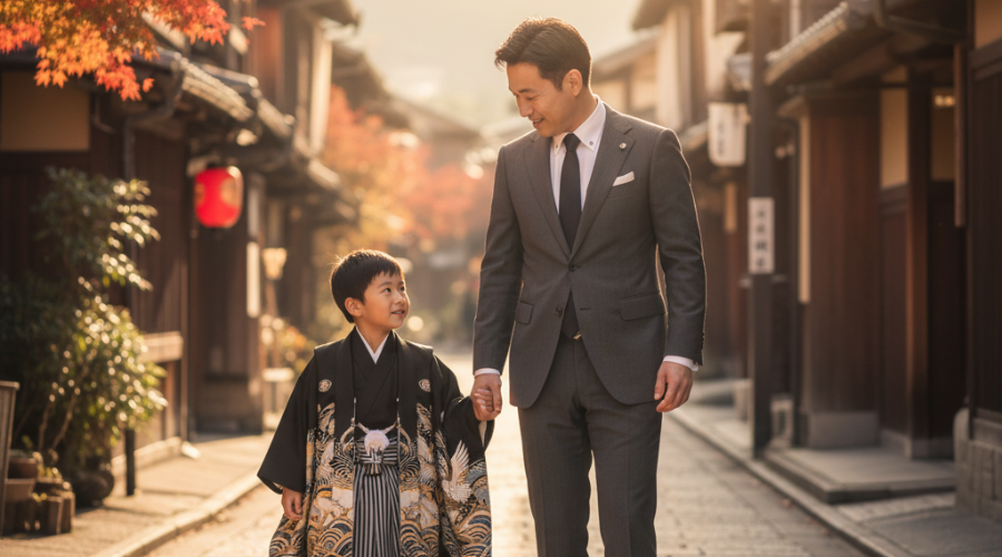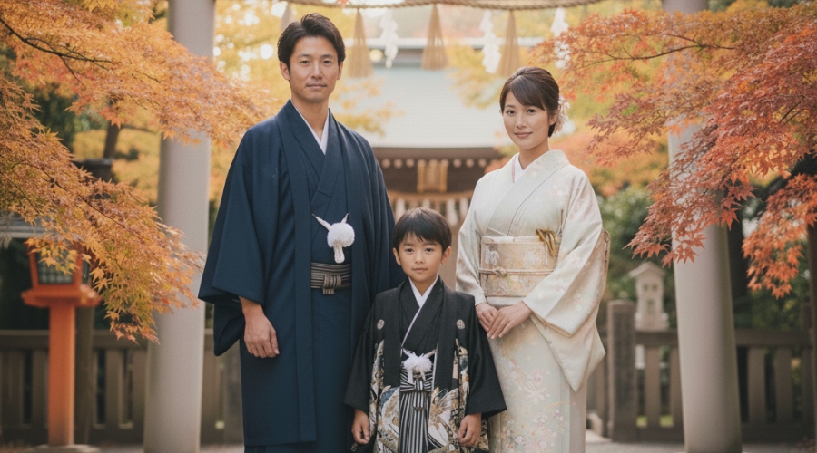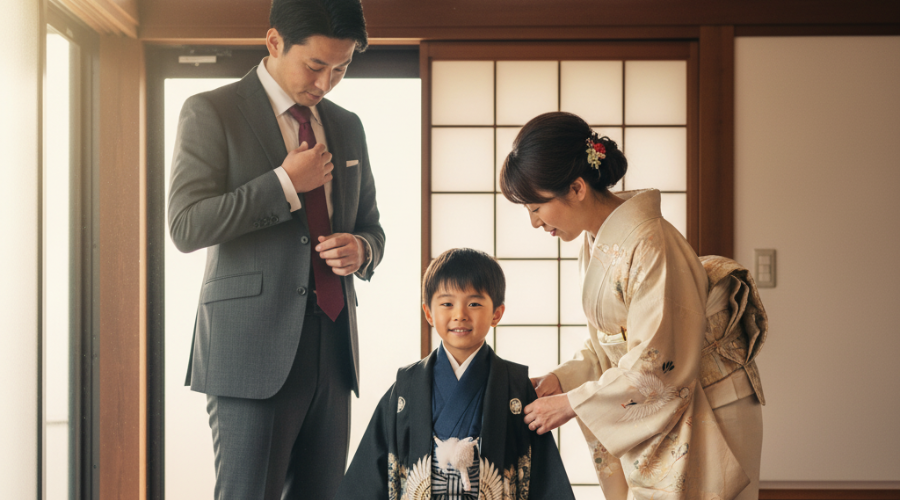 If your child or spouse wears kimono, the father choosing traditional attire as well will create a sense of harmony for the whole family, making the photos look even more elegant and festive.