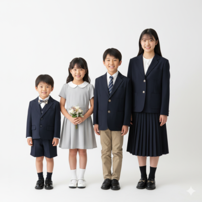 For elementary school children, wearing a school uniform is the safest choice. If there is no uniform, a collared shirt with a jacket works well. Girls can wear a simple dress with a cardigan for seasonal style, while boys look smart in a navy or gray jacket with basic trousers.