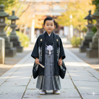 Traditionally, five-year-old boys wear a haori jacket and hakama trousers. The haori often features bold motifs such as hawks or samurai helmets, symbols of strength and courage. With the hakama, accessories like a short ceremonial sword (tantō) or a folding fan (suehiro) are carried.