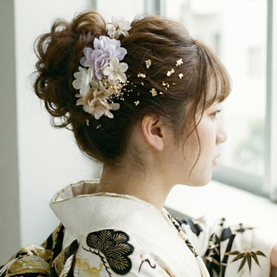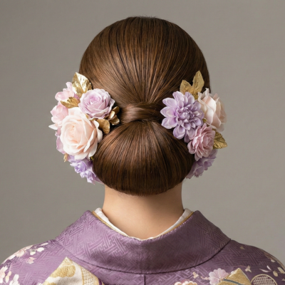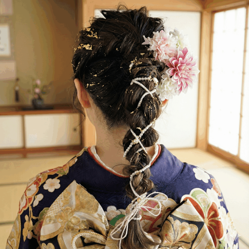- ここがポイント: 高すぎない位置でまとめると派手になりすぎず、上品な印象に。淡い色の髪飾りや、金箔・パールとの相性も最高です。