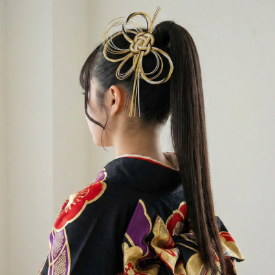 - ここがポイント: 紐アレンジ(タイトポニー)や、玉ねぎヘアなどバリエーションも豊富。水引を大胆にあしらうと、凛としたカッコいい雰囲気になります。