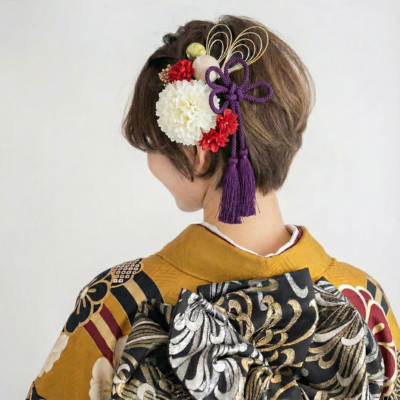 ◆ 深みのある紫で「大人っぽく」 →深い紫の大輪と小花を組み合わせた髪飾りで、飾りを盛りすぎたくない人にもおすすめ。つまみ細工の上品な質感が振袖の色柄を引き立て、アップスタイルにもダウンスタイルにもすっと馴染むデザインです。ひとつ付けるだけで写真映えも確保でき、成人式らしい華やかさがしっかり残ります。シンプル派の“主役級ワンポイント”として使いやすいアイテムです。