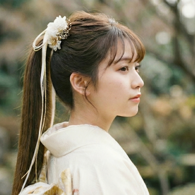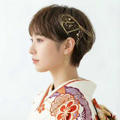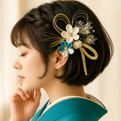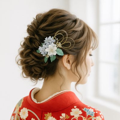 - ここがポイント: ショートやボブは「髪飾り」が主役。耳元に大きめの飾りをつけたり、金箔を散らすだけで、一気に洗練された振袖ヘアが完成します。