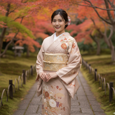 晩秋の紅葉に映える、やわらかなベージュピンクの訪問着。金糸の帯が秋の光を受けて、上品な華やかさを添えます。