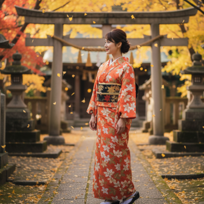 鮮やかな橙の小紋で、秋の神社散策を軽やかに。黒地の帯が全体を引き締め、季節の彩りを引き立てます。
