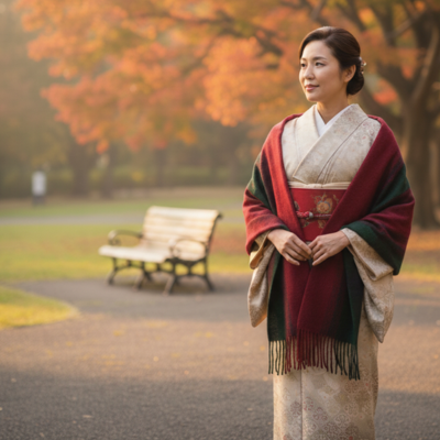 深紅のショールを羽織って、晩秋の装いにぬくもりを。落ち葉の公園で過ごす午後に、やさしい彩りを添えて。