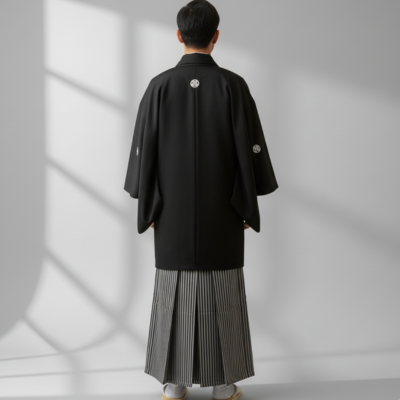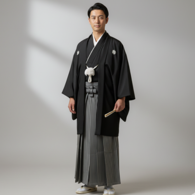 黒羽二重五つ紋付き(羽織袴): 凛とした佇まいで場を引き締める、男性の最も格式高い礼装です。