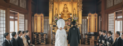 仏前式は、仏様(ご本尊)とご先祖様の前で、二人が夫婦となる**「縁(えにし)」に感謝を捧げる**儀式です。神前式とはまた違う、厳かで温かい感動があります。
