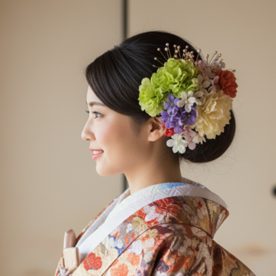 ヘアメイク洋髪生花・金箔・水引などを使った自由なヘアアレンジ。髪型を洋装風にできるので、**「かつらは抵抗がある」**という方も安心。